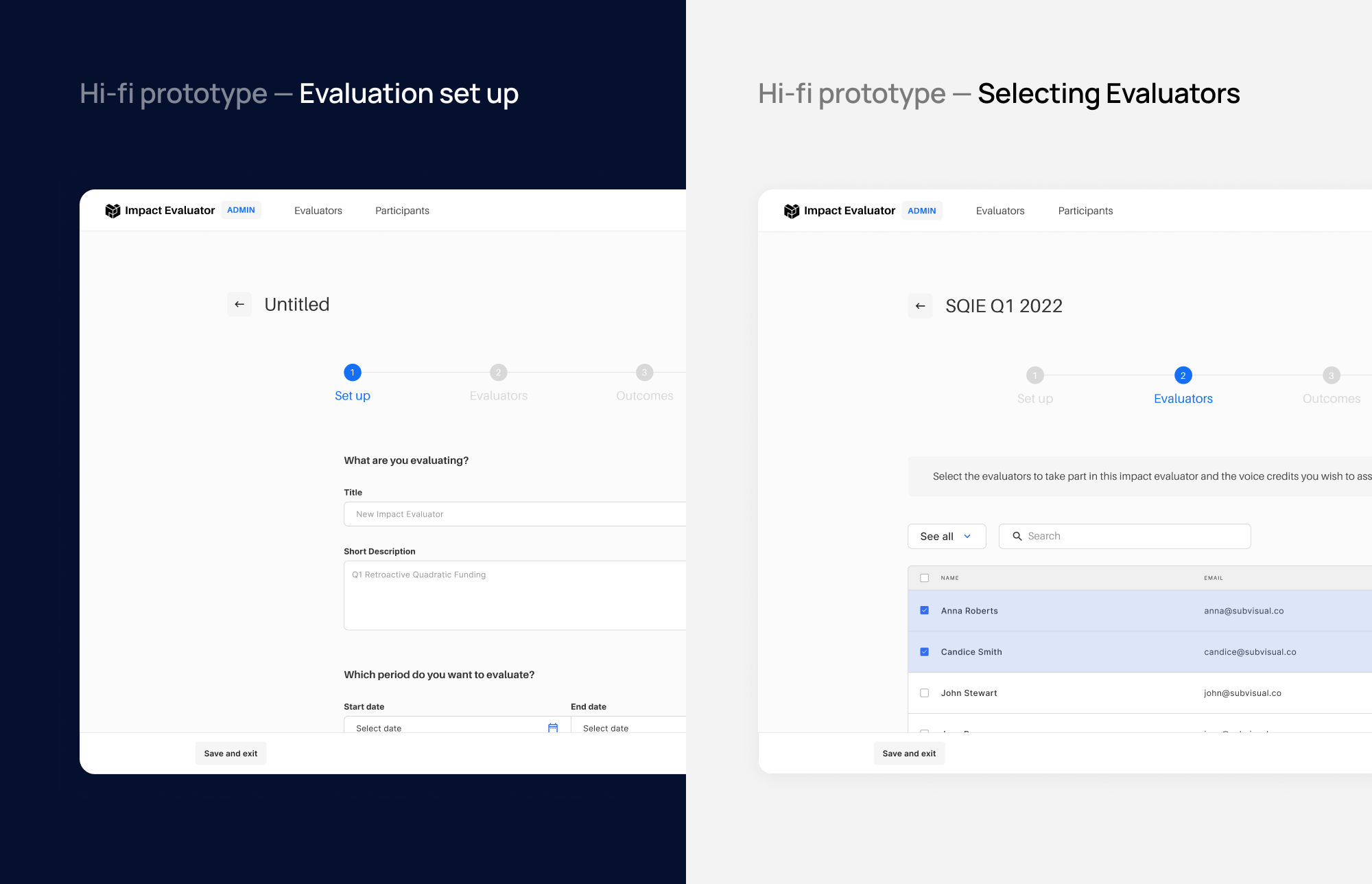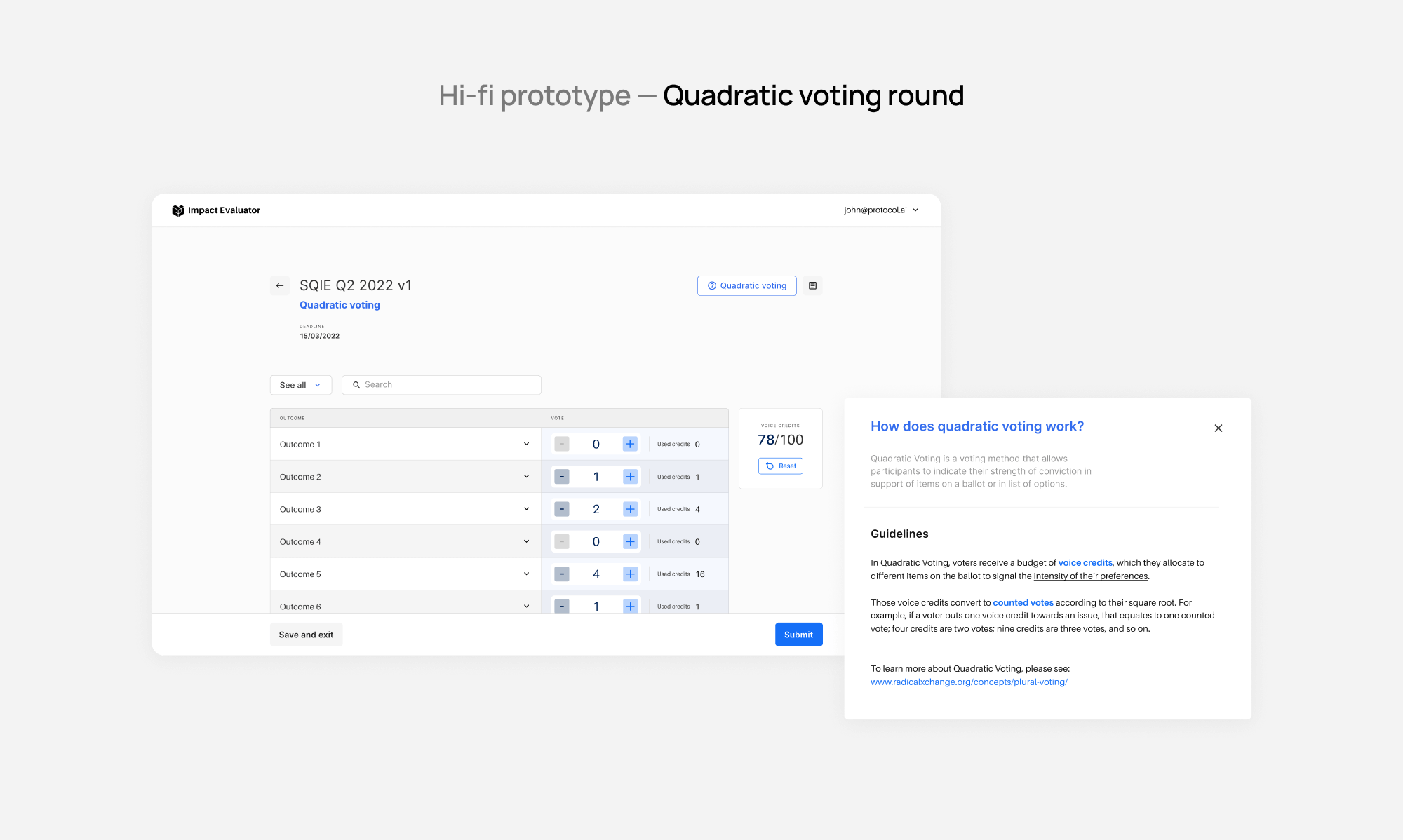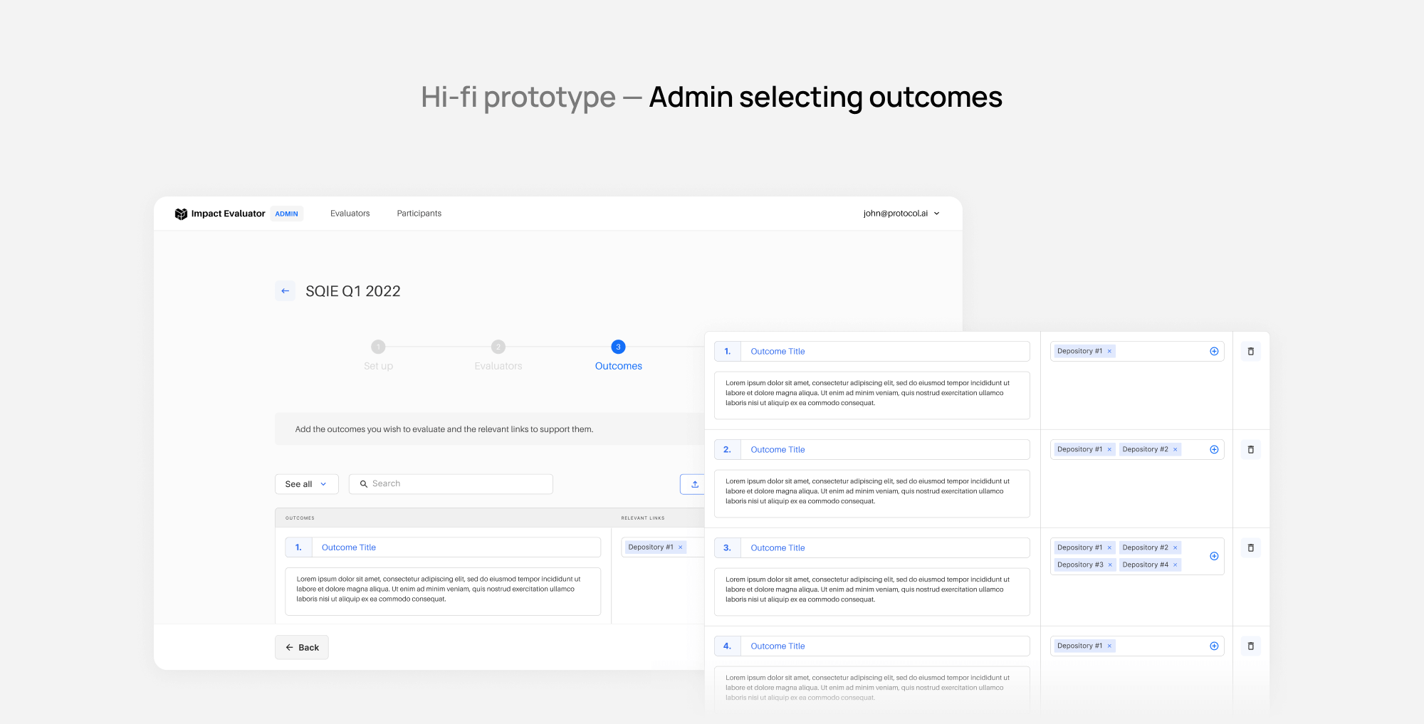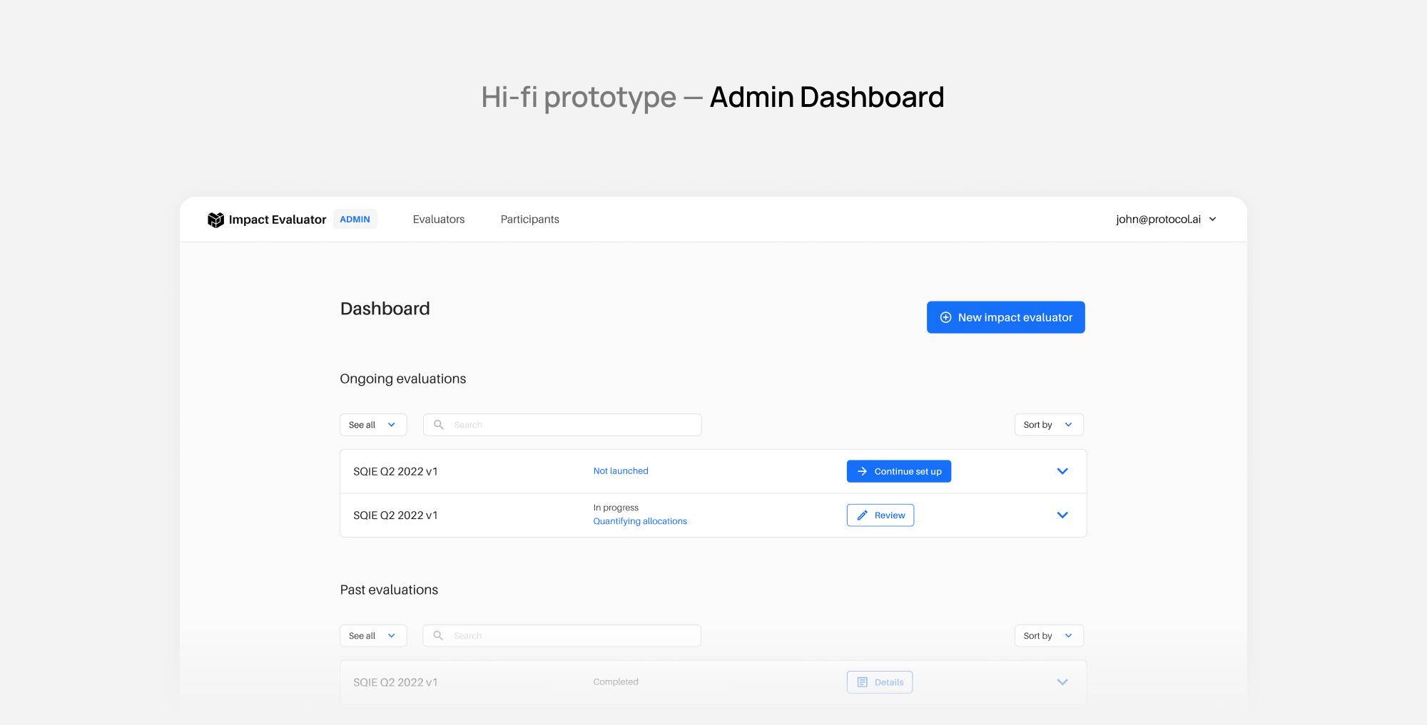 The team at Protocol Labs was already using an Excel file to perform the impact evaluations, but it was a very long and tedious process. Our goal was to provide an easier way for a community of evaluators to assess the impact of each outcome and its specific participants, in order for them to decide which projects would be retroactively funded and the amount of money they would receive.
